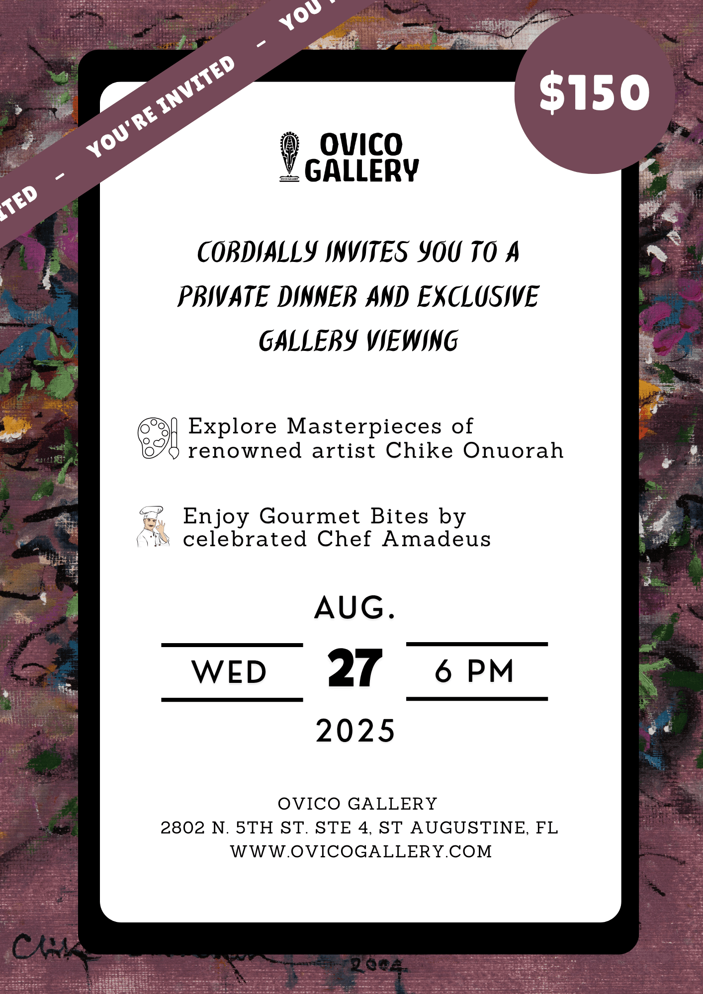 Join us for an unforgettable evening of fine art and fine dining at Ovico Gallery. This exclusive, private event offers a curated experience for just 6 guests—an intimate gathering where art and cuisine come together in perfect harmony.