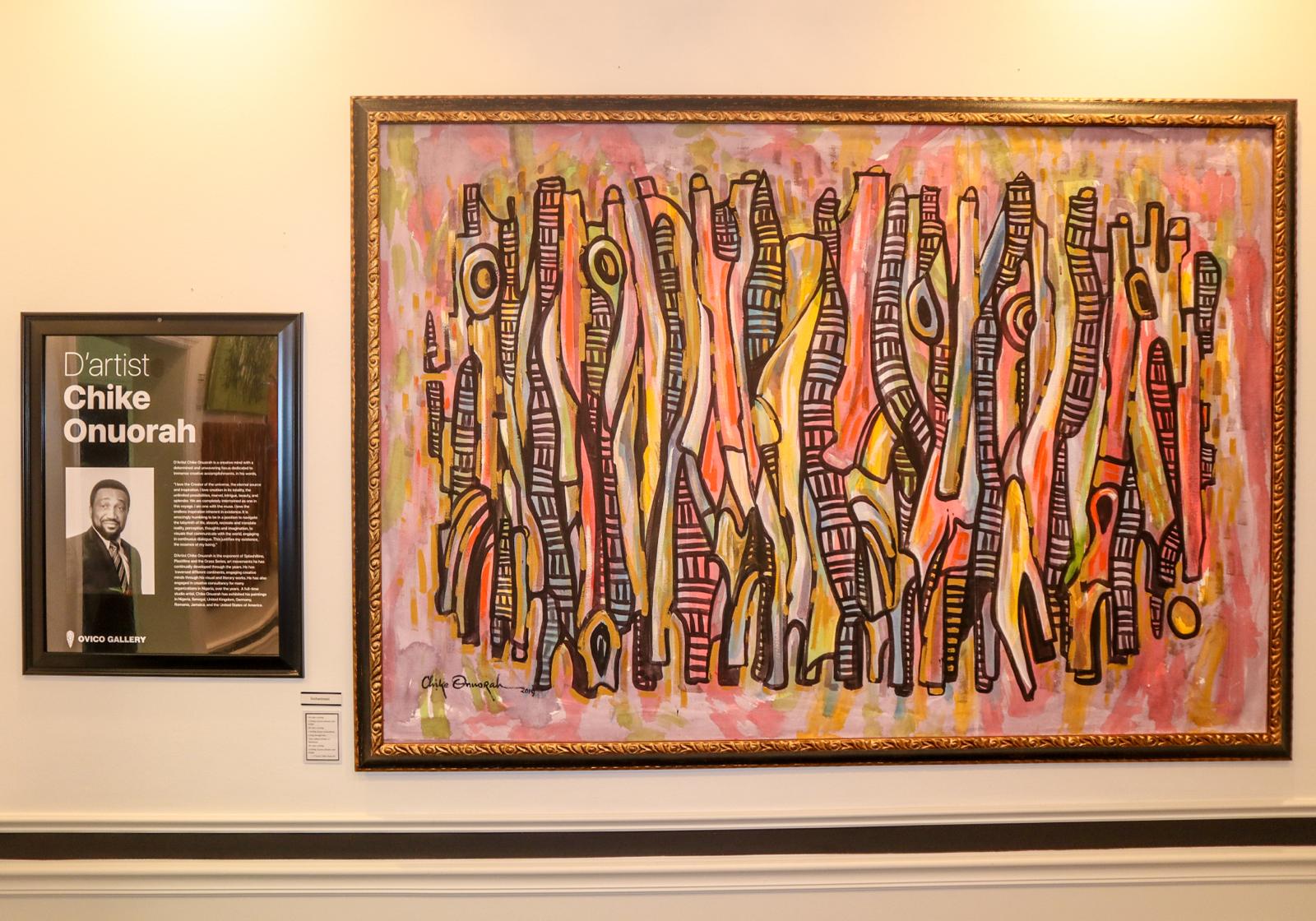 These paintings consist of multiple expressive images rendered with lines, shapes, forms and colors. The images are in elongated semi abstract style of Plastillino, one of the schools of art expounded by Chike Onuorah. They have a contemporary appeal emanating from traditional indigenous artistic expressions typical of the Igbo culture of west Africa.